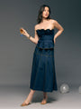 Design: Strapless pleated bustier top paired with a high-waisted A-line midi skirt featuring contrast zip stitch detailing