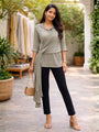 • Design: Collared top featuring an asymmetric draped overlay with a gathered side knot and extended panel detail, creating a layered, sculpted silhouette
